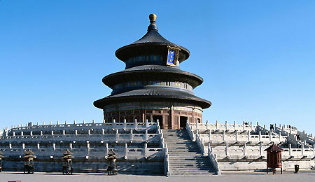 北京天坛在北京市东南部,崇文区永定门内大街东侧。占地约270万平方米,是中国现存最大的古代祭祀性建筑群。今日天安门东侧的劳动人民文化宫就是当年皇帝祭祖的地方,西侧的中山公园是祭祀丰收神即五谷耕地之所。 在整个北京城里,北有地坛祭地,南有天坛祭天,东有日坛祭太阳,西有月坛祭月亮,其中天坛最为光彩夺目、气宇非凡。天坛始建于明永乐十八年(1420年),清乾隆、光绪时曾重修改建。为明、清两代帝王祭祀皇天、祈五谷丰登之场所。 北京天坛是圜丘、祈谷两坛的总称,有坛墙两重,形成内外坛,坛墙南方北圆,象征天圆地方。主要建筑在内坛,圜丘坛在南、祈谷坛在北,二坛同在一条南北轴线上,中间有墙相隔。圜丘坛内主要建筑有圜丘坛、皇穹宇等等,祈谷坛内主要建筑有祈年殿、皇乾殿、祈年门等。著名的祈年殿在最北方,这是天坛内最宏伟、最华丽的建筑,也是想象中离天最近的地方。祈年殿的上下三层屋顶,均用深兰色琉璃瓦铺盖,象征天色。 坛面除中心的太极石是圆形外,外围各圈均为扇面形,数目也是阳数,象征九重天,天帝的牌位就安放在太极石上,象征着天帝高居九重天之上。圜丘坛的附属建筑有皇穹宇及回音壁。如果说天安门城楼已成为中国的象征,那么,天坛祈年殿就是北京这座不朽名城的象征。的确,这座无与伦比的建筑是智慧和文明的结晶,在通高38米、直径30米的体积内,容纳了 如此丰富的学问。 同时,她也是中国木结构建筑的顶峰,仅凭木榫交结,斗拱支架,全用木材就完成了这一惊世杰作。天坛另一美妙绝伦之处,是奇妙的回声。站在圜丘坛的中心叫一声,你会听到从地层深处传来的明亮而深沉的回响,这声音仿佛来自地心,又似乎来自天空,所以人们为它取了一个充满神秘色彩的名字:“天心石”。在皇穹宇的四周有一道厚约0.9米的围墙,你站在一端贴着墙小声说话,站在另一端的人只要耳贴墙面就能听得异常清晰,并且还有立体声效果,这就是“回音壁”。这证明500年前的中国人已经能够运用声学原理。 |