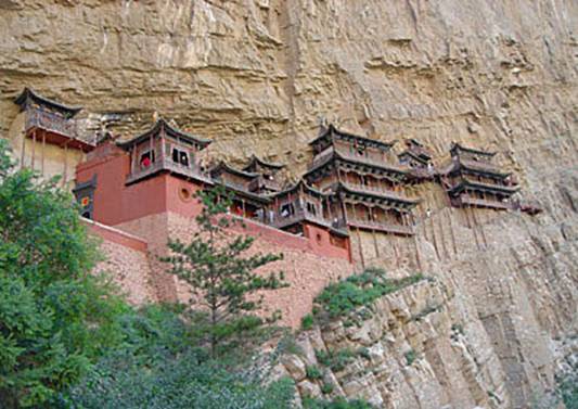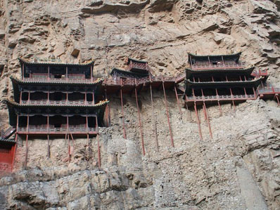 悬空寺,位于恒山脚下,在浑源悬城城南五公里处的金龙峡内西岩峭壁上。自古以来,这里一直被列为北岳恒山的第一奇观。新加坡电视连续剧《莲花争霸》曾在这里取景。 悬空寺,悬挂在北岳恒山金龙峡西侧翠屏峰的半崖峭壁间,始建于北魏太和15年(公元491年),始建初期,最高处的三教殿离地面90米,因历年河床淤积,现仅剩58米。1957年列为山西省重点文物保护单位,1982年,列入全国重点文物保护单位。整个寺院,上载危崖,下临深谷,背岩依龛,寺门向南,以西为正。全寺为木质框架式结构,依照力学原理,半插横梁为基,巧借岩石暗托,梁柱上下一体,廊栏左右紧联。仅152.5平米的面积建有大小房屋40间。悬空寺的总体布局以寺院、禅房、佛堂、三佛殿、太乙殿、关帝庙、鼓楼、钟楼、伽蓝殿、送子观音殿、地藏王菩萨殿、千手观间殿、释迦殿、雷音殿、三官殿、纯阳宫、栈道、三教殿、五佛殿等。  殿楼的分布都对称中有变化,分散中有联络,曲折回环,虚实相生,小巧玲珑,空间丰富,层次多变,小中见大,不觉为弹丸之地,布局紧凑,错落相依,其布局既不同于平川寺院的中轴突出,左右对称,也不同于山地宫观依山势逐步升高的格局,均依崖壁凹凸,审形度势,顺其自然,凌空而构,看上去,层叠错落,变化微妙,使形体的组合和空间对比达到了井然有序的艺术效果。远望悬空寺,像一付玲珑剔透的浮雕,镶嵌在万仞峭壁间,近看悬空寺,大有凌空欲飞之势。登临悬空寺,攀悬梯,跨飞栈,穿石窟,钻天窗,走屋脊,步曲廊,几经周折,忽上忽下,左右回旋,仰视一线青天,俯首而视,峡水长流,叮咚成曲,如置身于九天宫阙,犹如腾云皈梦。 悬空寺不仅外貌惊险,奇特、壮观,建筑构造也颇具特色,形式丰富多彩,屋檐有单檐、重檐、三层檐,结桅构有抬梁结构、平顶结构、斗拱结构,屋顶有正脊、垂脊、戗脊、贫脊。总体外观,巧构宏制,重重叠叠,造成一种窟中有楼,楼中有穴,半壁楼殿半壁窟,窟连殿,殿连楼的独特风格,它既融合了我国园林建筑艺术,又不失我国传统建筑的格局。 悬空寺内现存的各种铜铸、铁铸、泥塑,石刻造像中,不少风格,体例具有早时期的特点,是具有较高艺术价值的珍品。悬空寺是历代文人墨客向往之处,古代诗人形象的赞叹:"飞阁丹崖上,白云几度封,蜃楼疑海上,鸟到没云中"。公元735年,诗仙李白游览后,在岩壁上写下了"壮观"二个大字。明崇祯六年,徐霞客游历到此,称之为"天下巨观"。李铁映同志1989年来恒山视察时,挥毫写下了"伟哉神工"四个大字,当人们感概之余,不竞要问,建悬空寺的初衷是什么?为什么历经1500多年,能够保存完好?