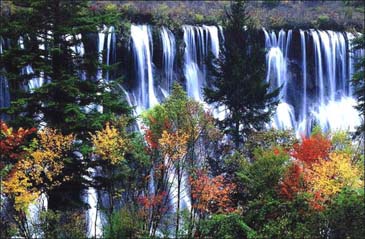 九寨沟的瀑布令人神往。这里河道纵横,水流顺着呈台阶形的河谷奔腾而下,形成数不清的瀑布。有的细水涓涓,有的急流直下,有的若玉带飘舞,有的似银河奔泻,宽度或长度超过贵州黄果树瀑布的就有六条之多。其中“诺日郎瀑布”,高约30米,宽达百米,水流凌空而下,银花四溅,水声隆隆。水从静海穿林过滩慢悠悠的流来,又从陡岩上猛然跌下深渊,发出轰雷般的响声,声势极为壮观。