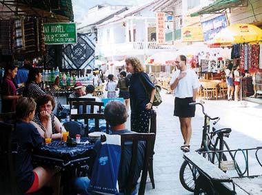 阳朔西街又被戏称洋人街,已有1400多年的历史。西街至今仍是小家碧玉型的南方村镇建筑规模,但却显现着国际情调的人文景观。这里的酒吧、饭店、网吧、工艺品书画店等装修风格大多中西合璧,有外语招牌,工艺品书画店、饭店、酒吧的服务员、普通居民以至于街上卖水果的老太太,都能讲一口流利的英语,这就给西街染上了一笔异域色彩。在西街的每一个角落,您会经常看到三五成群不同肤色的旅游者临街围坐在一起喝啤酒、品咖啡、嬉戏聊天,还有那不受当地计划生育限制的中国母亲和西欧国家的父亲,领着混血儿在街上玩耍。 其实,在阳朔游览西街完全是一种体验——她浓浓的乡村氛围中流淌着纯正的小资情调,朴素的民风里包容着令人惊讶的国际元素,阳朔人爱吃的糍粑与米粉、正宗的意大利咖啡与西餐、古老的中国画、最前卫的休闲风尚、国语、英文、法语、意大利语乃至西班牙语……种种看似不可能的,全部柔合在长度不足1000米的岭南小街里。 这里的人们——不管是外国人或者本地人,应当说是一群不折不扣“生活者”;这里的一切都为任何路过的人构筑了最休闲的氛围。因此,来到西街,您只要带上您在百忙中想读而没有时间细读的书、想听而又没有环境情绪听的CD(不带也无所谓,反正西街上绝对有您喜爱的东西)、邀上您最亲近的朋友,关掉手机与手提电脑,要一杯咖啡或茗茶,让美景与音乐陪您度过最惬意的一段时光吧——“偷得浮生几日闲”,您在这里能真正体验什么是生活。