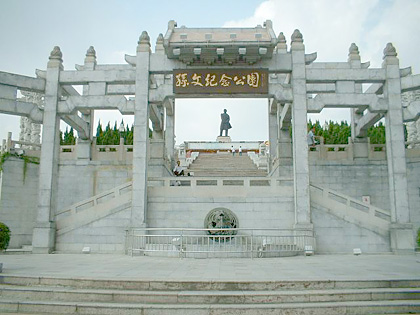 孙文纪念公园位于中山市中心城区南面,兴中道与城桂路的连接处,坐落在中山新十景“兴中缀锦”上。占地26.6公顷,1996年11月孙中山先生诞辰之日全面竣工开放。这个公园的牌匾还是由台湾著名书法家、岭南派国画大师欧豪年教授书写。与其他旅游景点不同,该公园不设门票,游人可以免费进园自由参观游览。 孙文纪念公园主要由两个平缓的山坡改建而成,分为革命纪念区和综合游览区两个不同功能的区域。革命纪念区以纪念孙中山先生的题材为主,设有孙中山先生铜像、喷水池以及松园、竹园、梅园和栽种了999株龙柏的龙柏山等景点。与革命纪念区遥遥相对的是综合游览区,这个游览区设有“香山”、“飞来石”、“一线天”、“水帘洞”、“观景阁”、“迎阳石”等景点。整个公园重点突出了“纪念”的主题,景点的布局也紧紧围绕主题铺排。 从公园的正门穿过用花岗岩雕刻筑就的公园牌坊拾级而上,便进入了公园的革命纪念区。在这里,首先映入眼帘的是两旁青翠挺拔的龙柏以及6支高大的华表,整个环境显得庄严肃穆。沿着花岗岩台阶拾级而上,很快就到达山顶的平台,此时,孙中山先生顶天立地的高大、威武的塑像便呈现在眼前。 顺着孙中山先生塑像的目光回首北望,高楼林立、充满现代化动感的中山城区一览无遗。尤其是宽敞平直、车水马龙,有“兴中缀锦”之称的兴中道更令人不得不叹服伟人故里,名城中山的大气和亮丽。往东看,宽阔的城桂公路、博爱路,以及新城区的高楼大厦一一映入眼前。往南看是中山人用慈善万人行活动筹得的善款兴建的博爱医院,站在孙中山先生雕像的脚下欣赏这座医院,游客不但可以观赏到其建筑风格的别致,而且,还可以领略到中山人的爱心。往西看,则是风景优美的公园综合游览区。当然,从孙中山先生塑像后面的台阶往下走,游客还可以游览松园、竹园、梅园等景点。 孙文公园的革命纪念区与综合游览区之间,有一个宽阔的草坪,草坪绿草如茵,一侧亭台水榭立于绿树红花中,另一侧,石雕、椰树尽显热带风情。沿着草坪中间的步行通道,片刻工夫便来到了综合游览区。 到达综合游览区时,首先映入眼帘的是孙中山先生书写的“后来居上”几个刚劲有力的大字。沿着两旁的台阶顺路而上,便进入了香山园。这时,你会发现这里真是举目皆美景。巨大的“飞来石”;虽人工筑就,但颇具特色的“一线天”;巨石林立、垂柳依依、水声潺潺的“水帘洞”;以及既可观赏整个园区,又可欣赏中山石岐城区全景的“观景阁”等景点无不令人流连忘返。尤其值得一提的是,这里还有一个栽有近3万棵杜鹃的杜鹃园,每年3至4月,春暖花开时节,满山杜鹃盛放时,整个杜鹃园便成了花的海洋,人的海洋。色彩鲜艳的杜鹃花,随风而转的彩色风车构成一道迷人、浪漫的风景。这个时候,无论是外来的游客、还是本地的居民,又或者是平常忙于工作,极少外出旅游的外来劳工都会想方设法到这里赏花、留影。 也许是孙文纪念公园真的太漂亮,也许是孙文公园同时兼顾了纪念与休闲两大功能的缘故,总之,这个中山市民身边的幽景每天都游人如织。